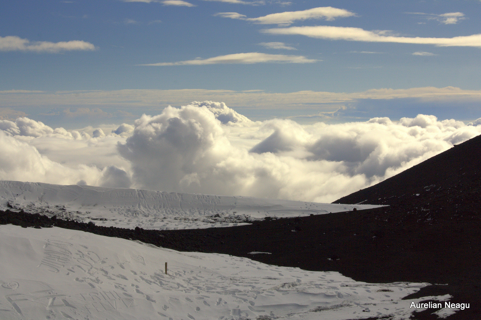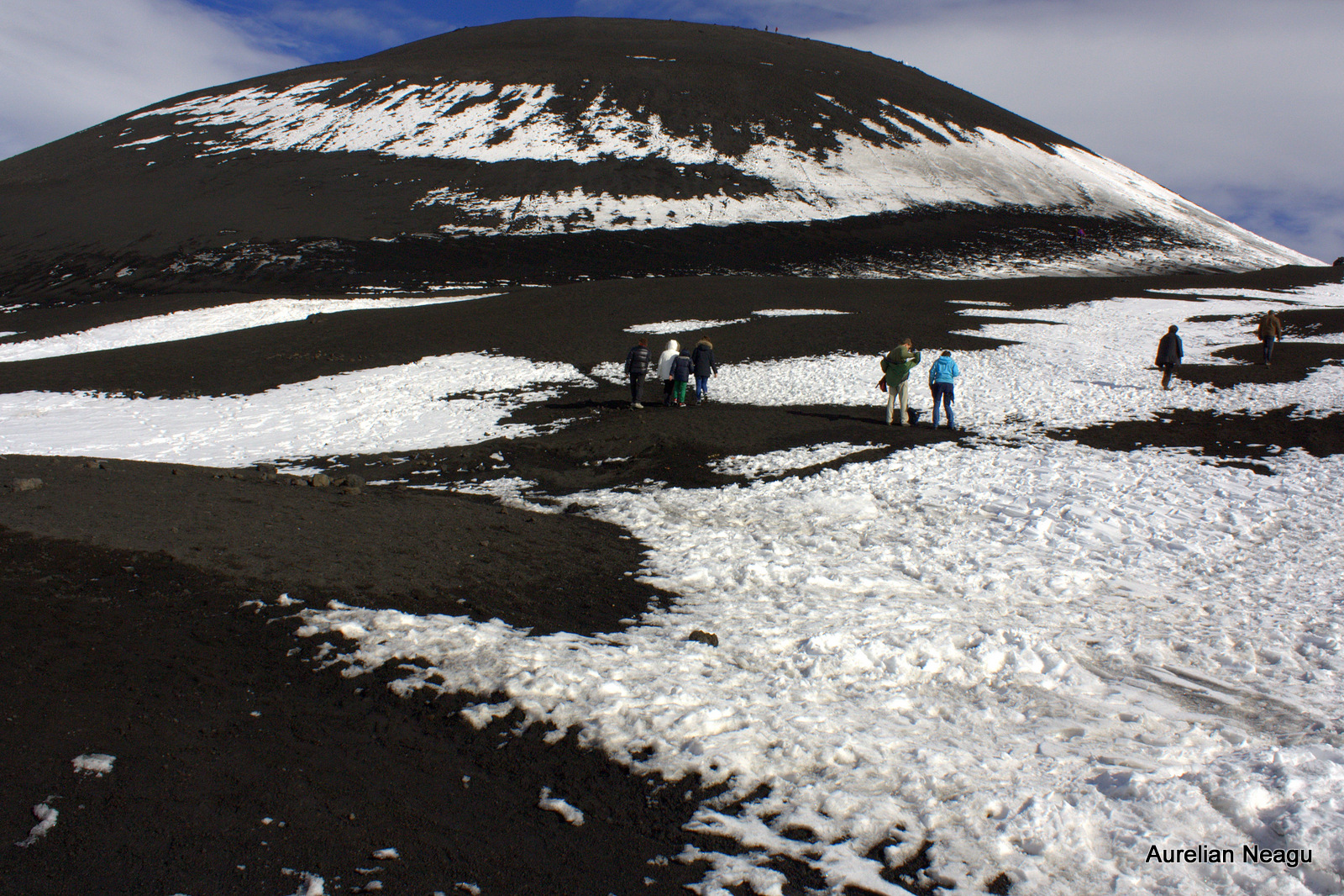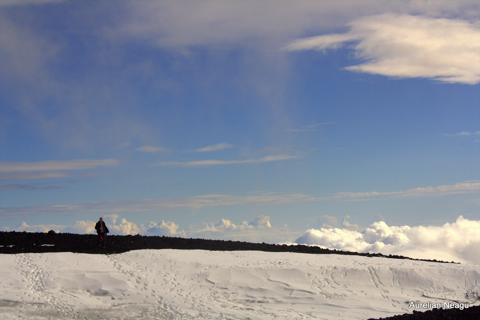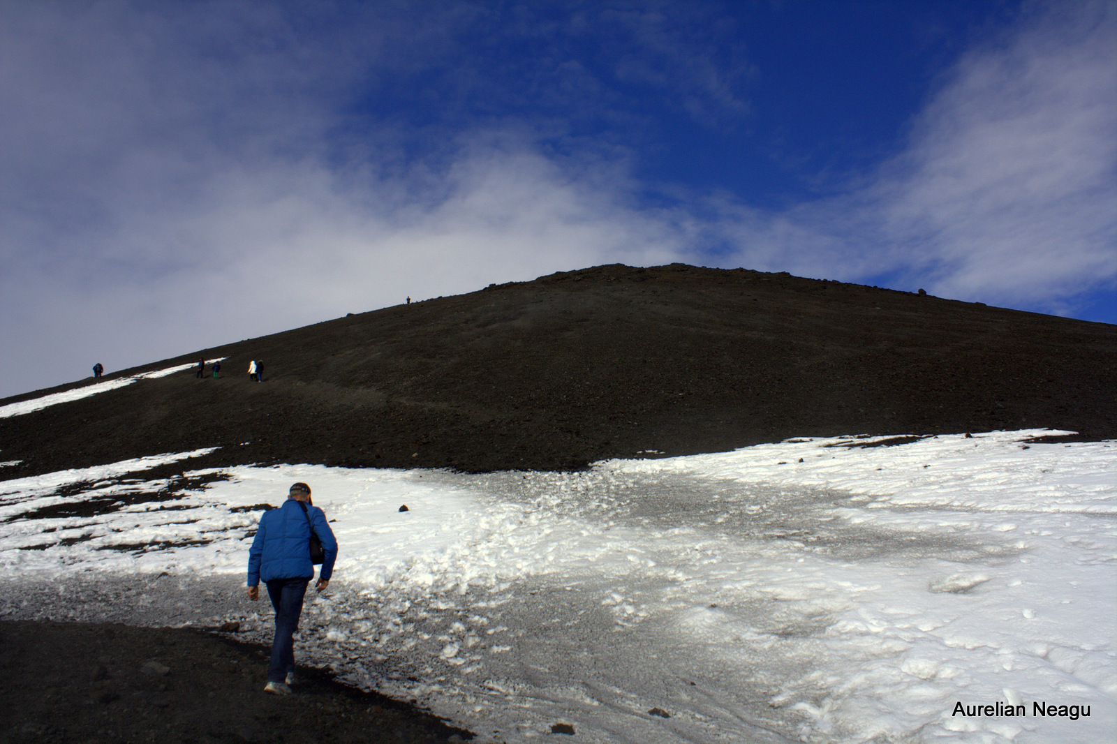 Nu-i nimic, plecăm mai departe pe jos şi fără să ne dăm seama, începem din nou să urcăm, de data asta cu paşii noştri. Urcăm ceea ce pare a fi un fel de crater. Şi pe măsură ce urcăm, zăpada începe să dispară.