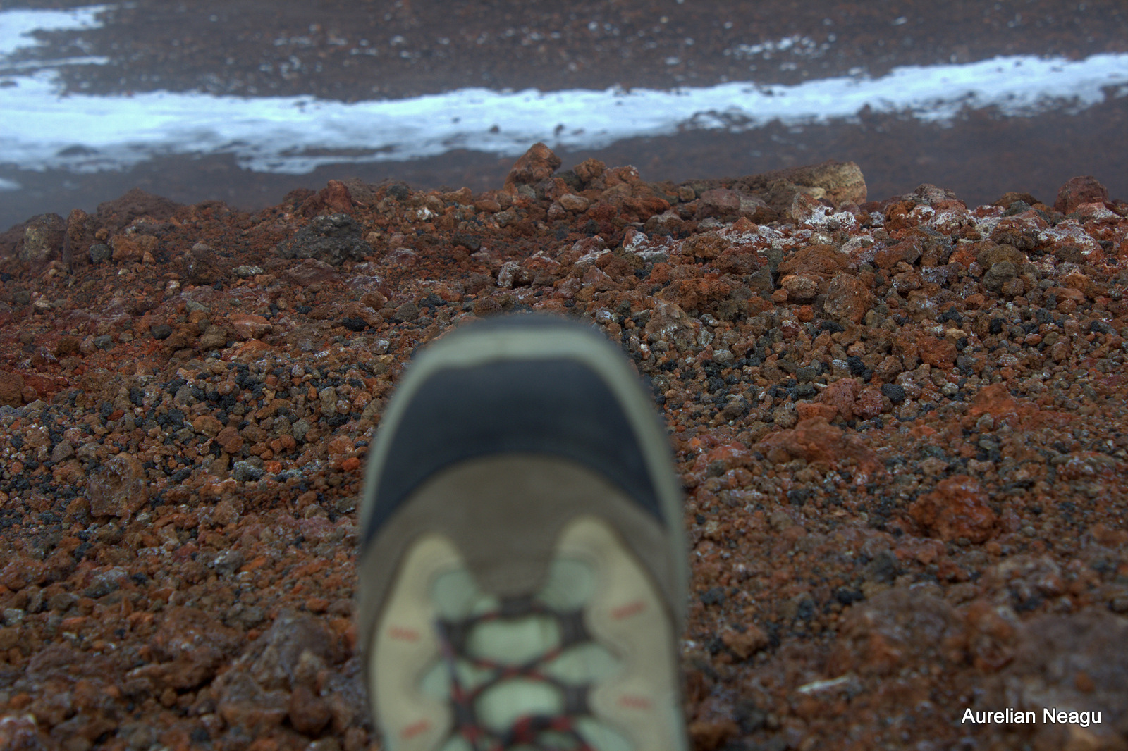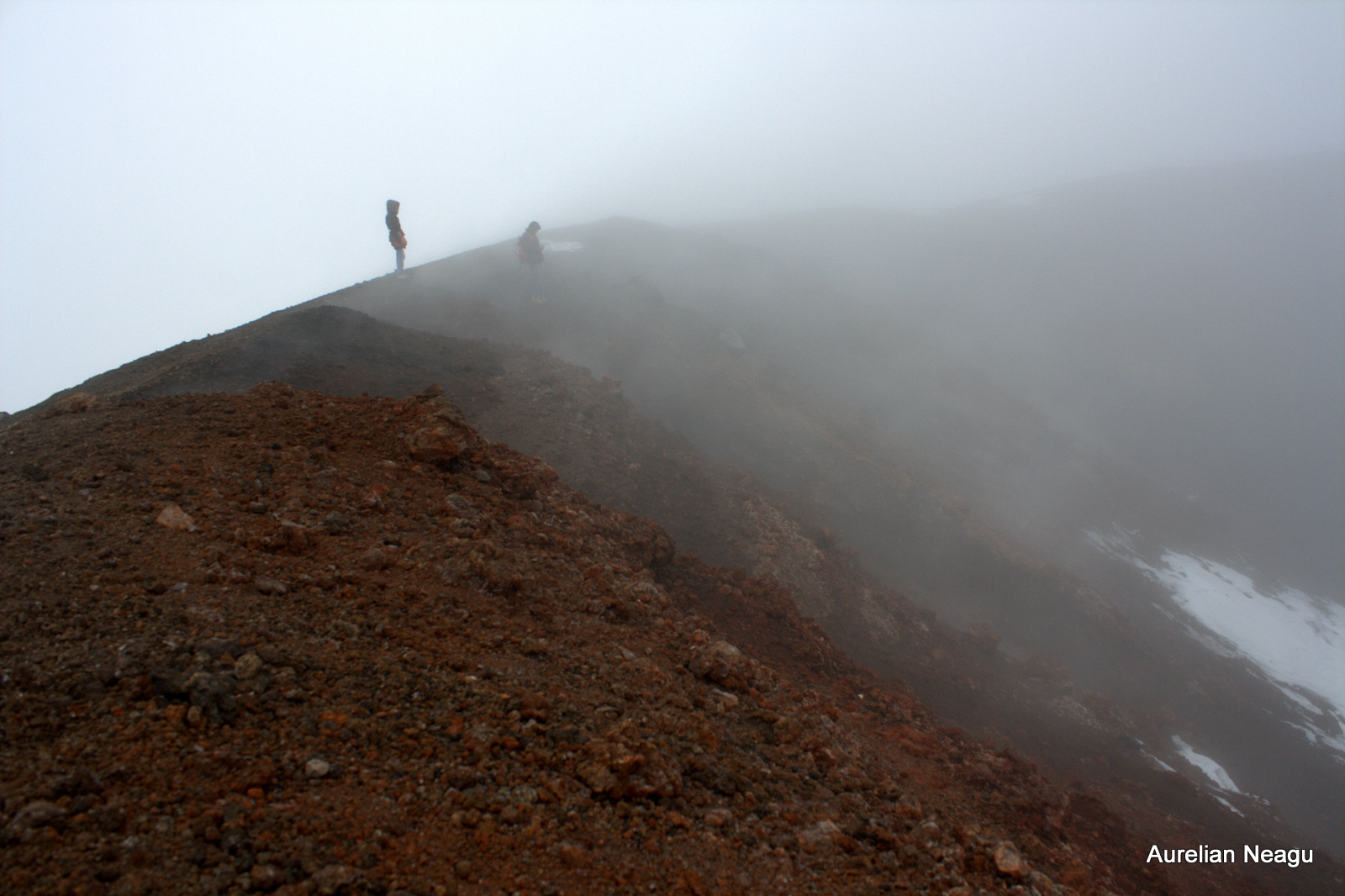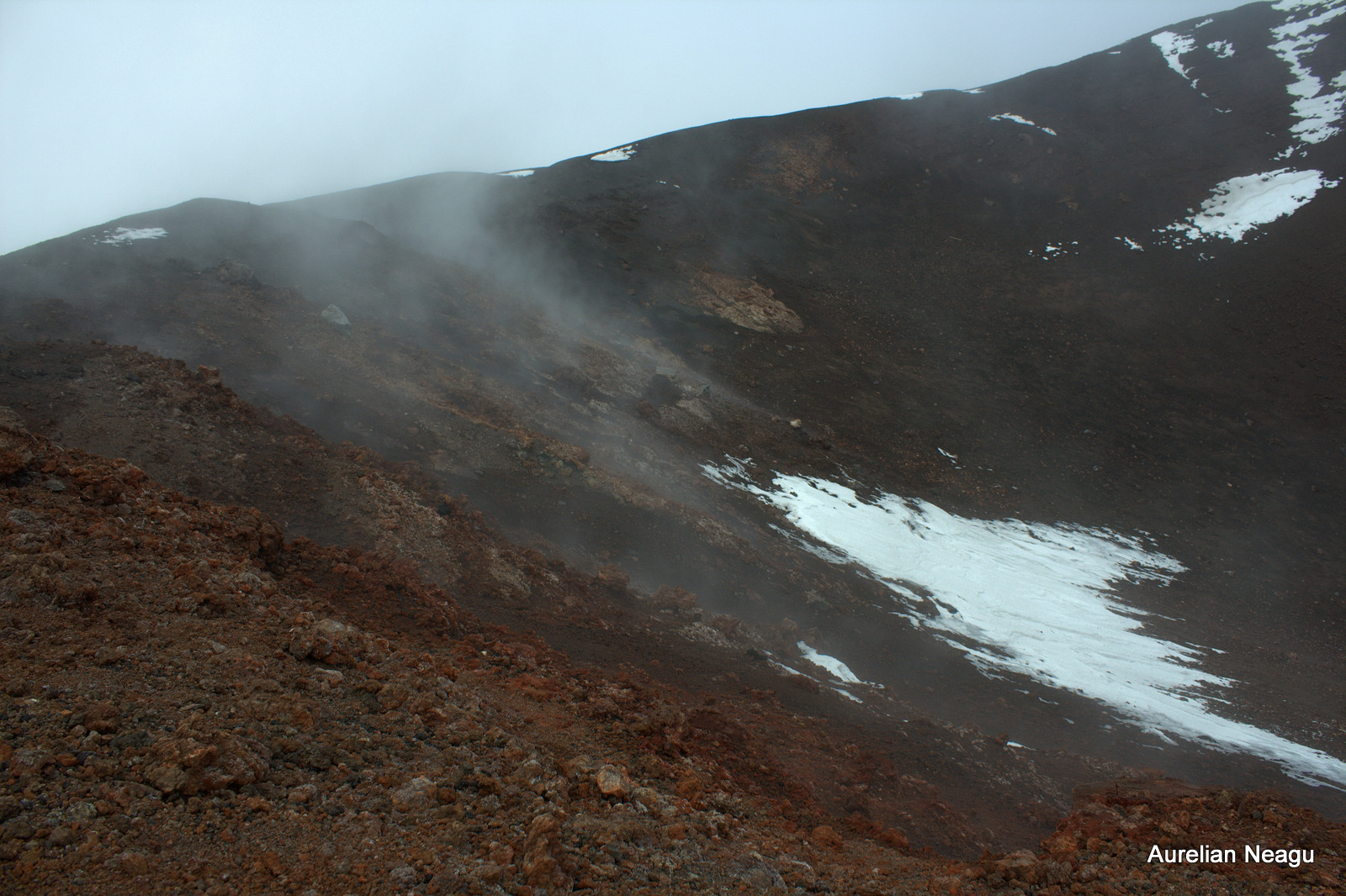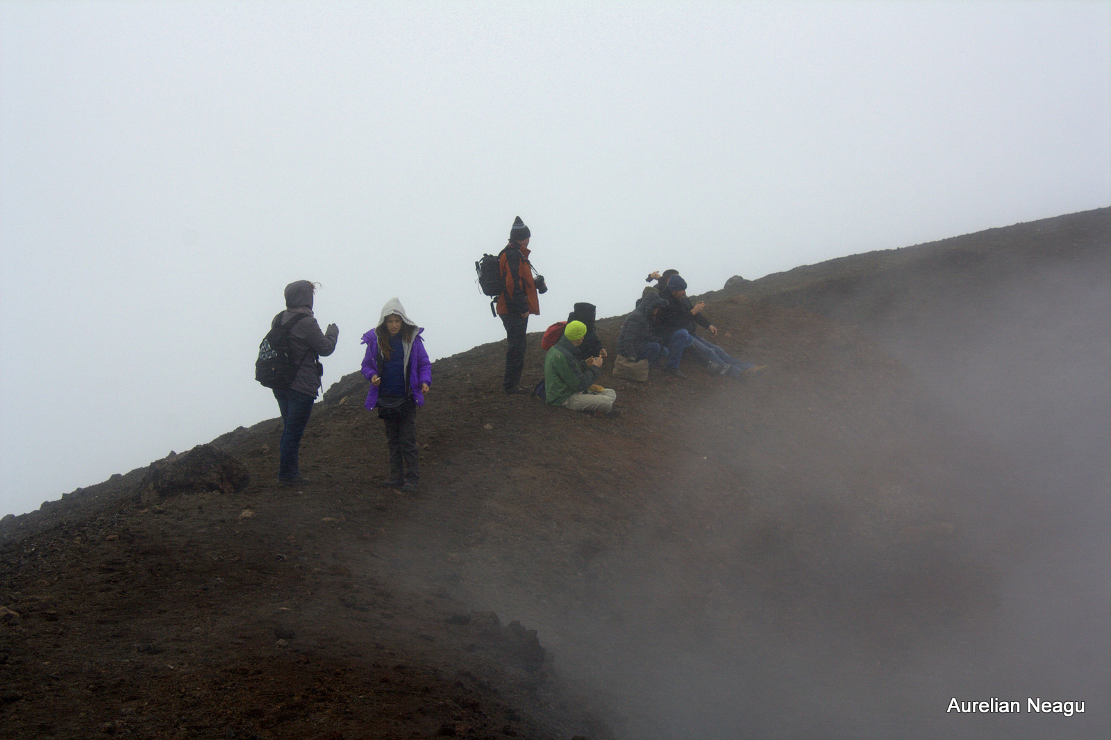 Ajungem pe marginea craterului şi ne aşezăm. După câteva minute simţim că nu mai putem sta jos şi realizăm de ce nu e zăpadă pe platou. Pământul de sub noi e fierbinte. Poţi sta jos, dar nu mai mult de 5-10 minute.