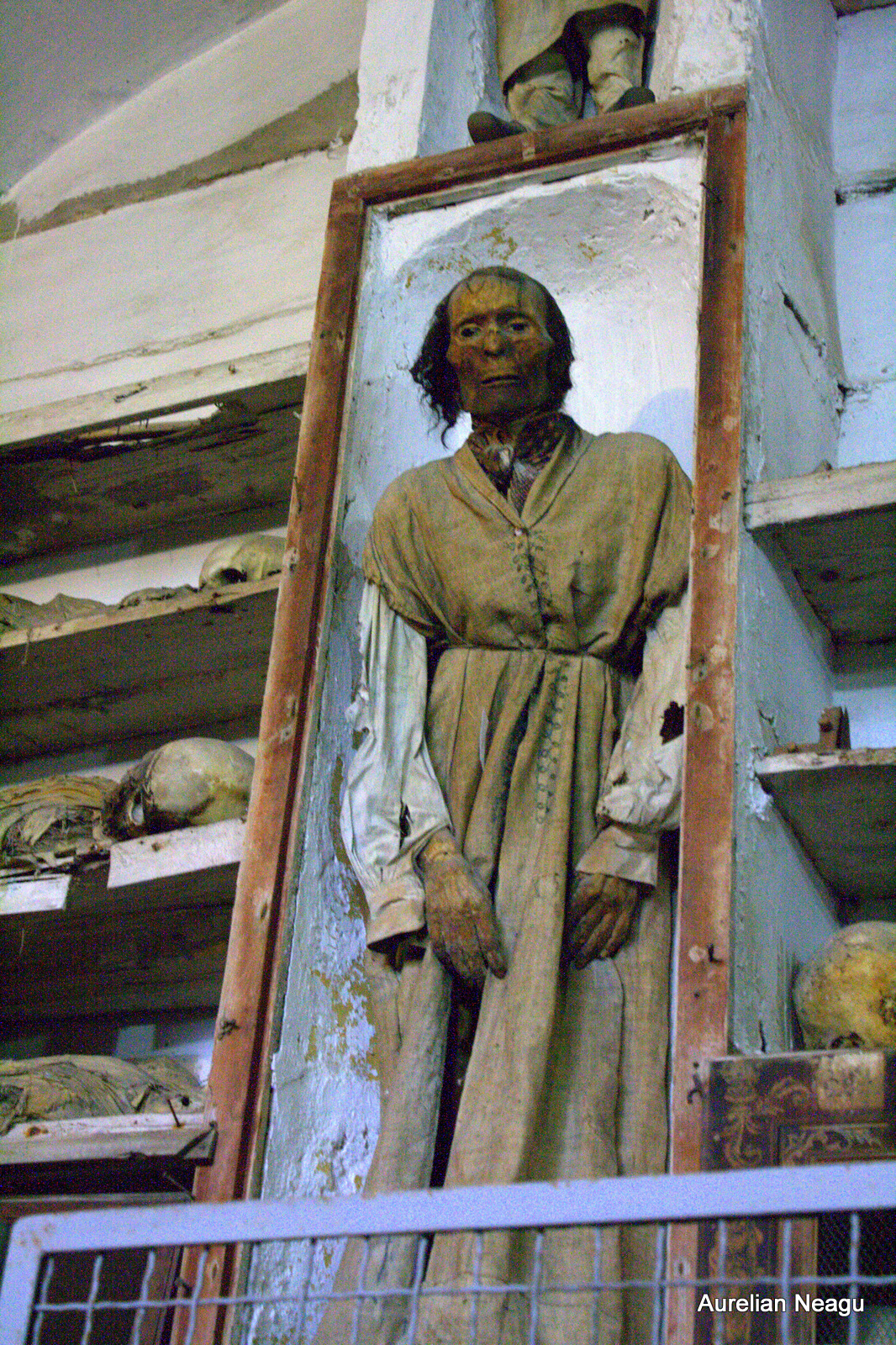Şi nu oricum, nu vor fi undeva pe jos ca să te simţi tu în siguranţă, vor fi în picioare, agăţaţi de/pe pereţi în hainele cu care au fost îmbrăcaţi atunci când au murit şi atât de bine mumificaţi încât ai impresia că până ieri erau în viaţă. Până ieri vorbeau, mergeau, mâncau şi visau. La fel ca tine.